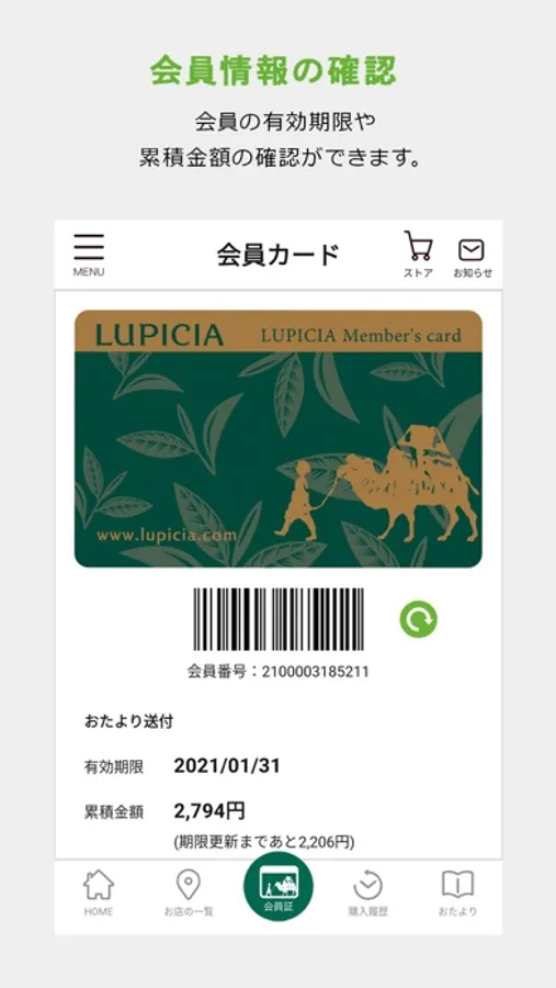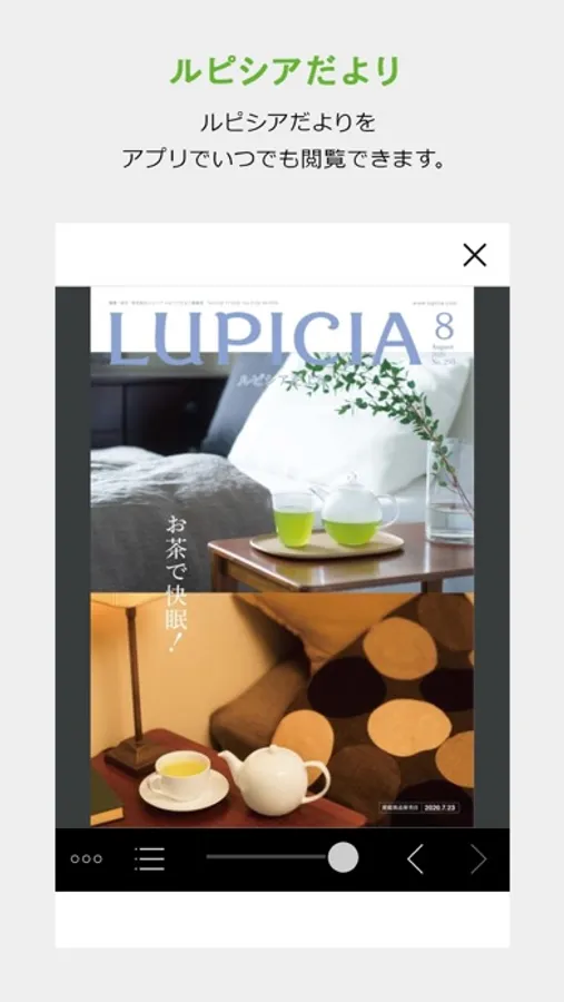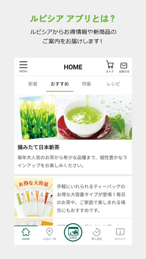 ルピシアからの最新情報をお届けするほか、会員カードのご利用や、お近くの店舗の検索、購入履歴の確認、ルピシアだよりの最新号などをご覧いただけます。