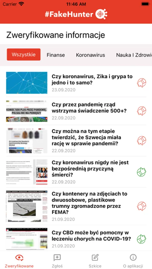 - Przeglądanie wszystkich opublikowanych przez zespół #FakeHunter werdyktów i raportów z weryfikacji faktów według kategorii tematycznych