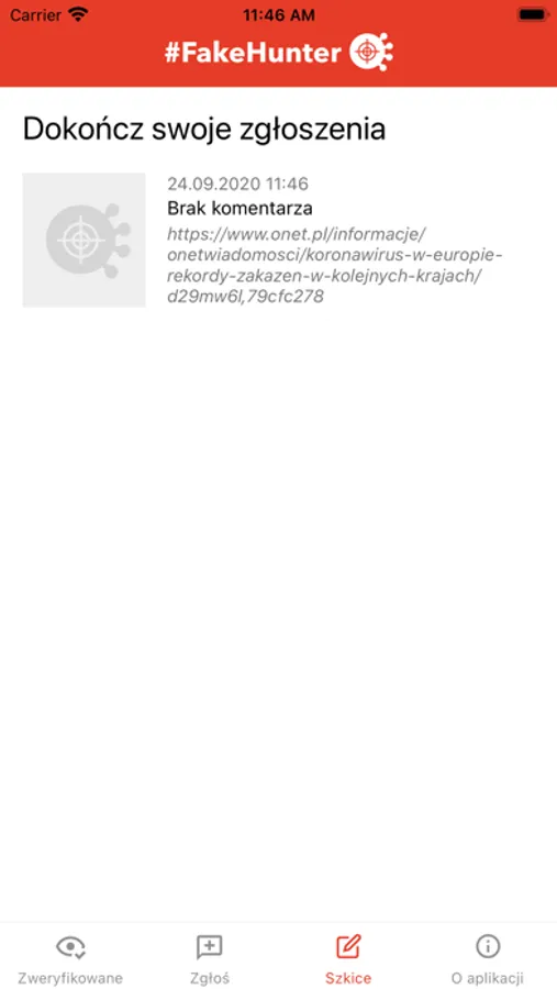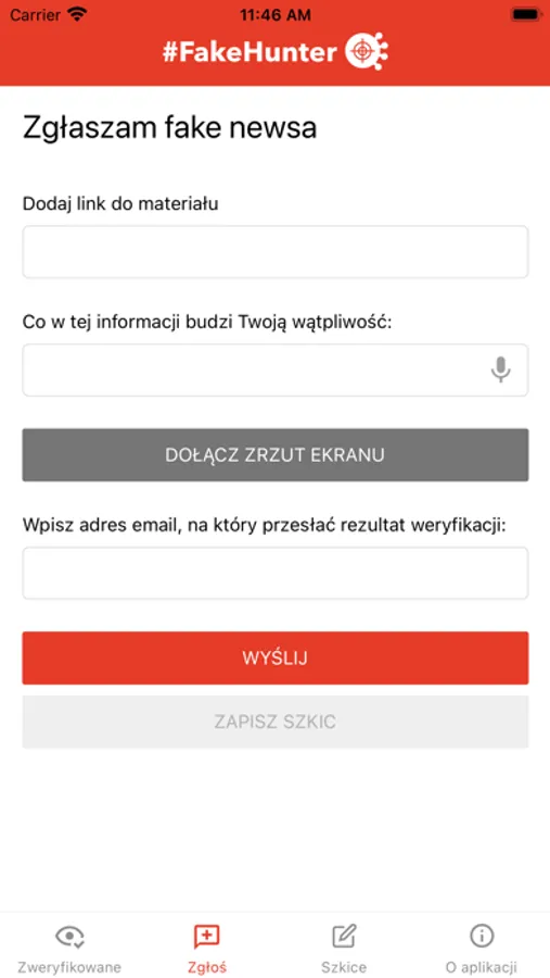 - Powiadomienia o weryfikacji zgłoszeń przez zespół weryfikujący fakty na podstawie wprowadzonego adresu email