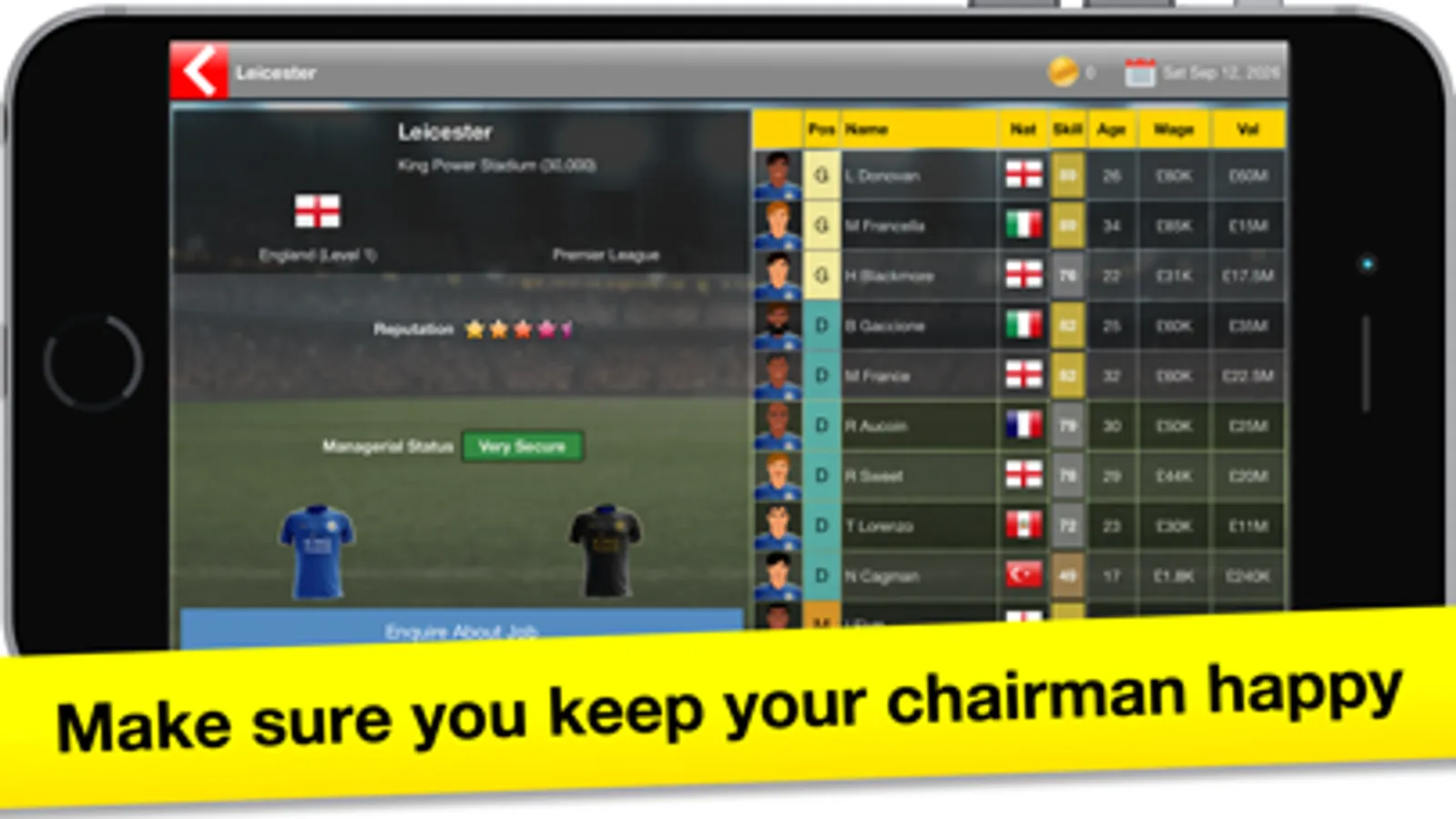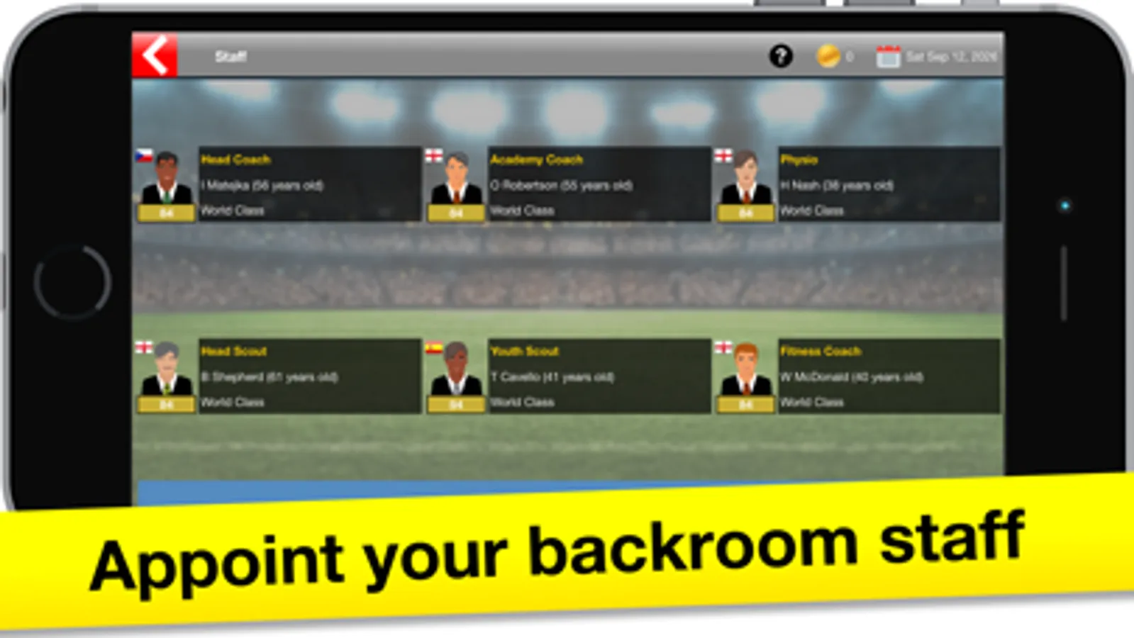 There are other personnel to help you manage the club. The Head Coach, Academy Coach, Physio, Head Scout, Youth Scout and Fitness Coach all play their part in the success of the club. Hire and fire them at the right time to achieve the best results for your team.