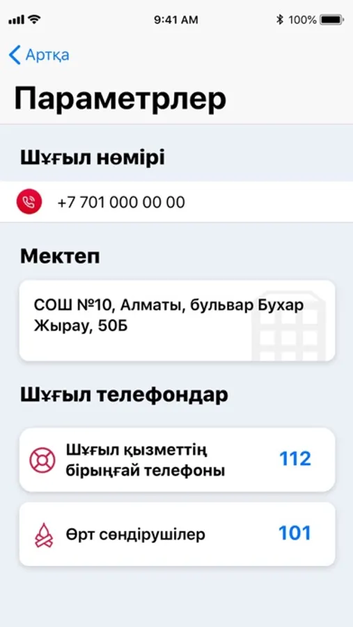Егер бірдеңе болса, Сіз берген жедел нөмірге қоңырау шалуға немесе негізгі жедел қызметтердің нөмірлерін білуге мүмкіндік аласыз. Бұл уақытта Сіздің ата-аналарыңыз қазірдің өзінде көмектесу үшін қайда баруға қажет екендігін білетін болады.