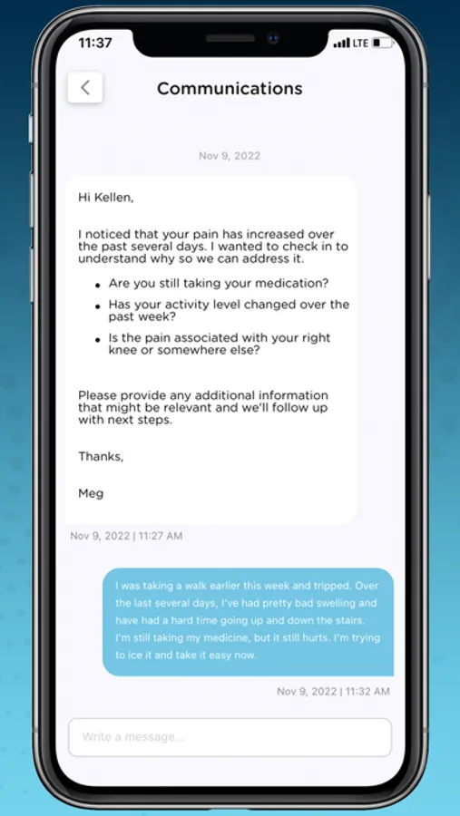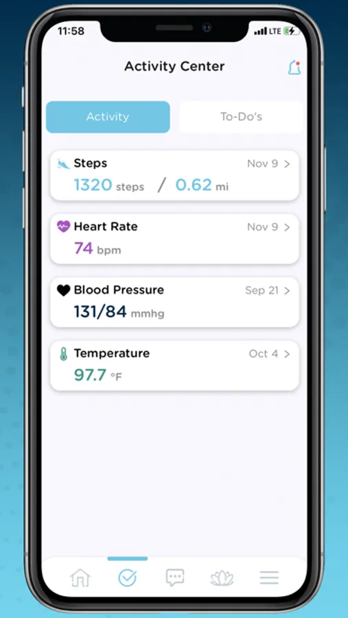 Depending on your care path, your provider may ask that you connect various devices, such as an activity tracker, blood pressure cuff and/or a weight scale to your device. You will receive alerts reminding you to use your devices as prescribed by your physician.