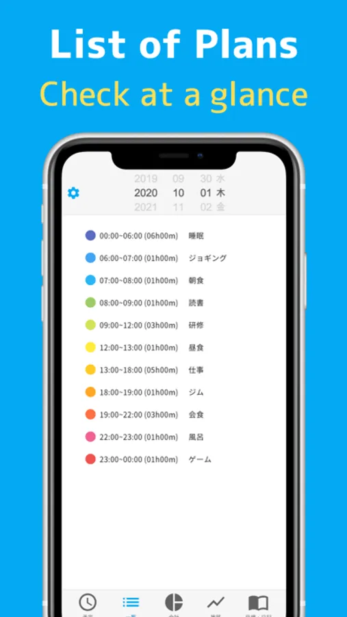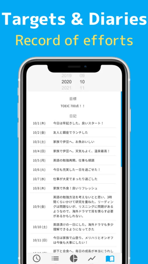 It is equipped with all the functions necessary for schedule management, such as automatic totaling of total time, display of transitions by bar graph, registration of diary and goals, and remind function by push notification.