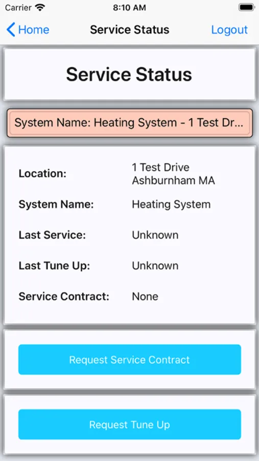 - View your service status. This will show the system name, last service, and last tune up for a location.