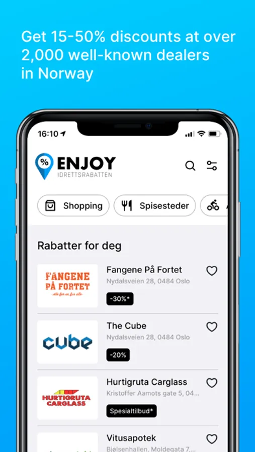With its more than 2,000 points of use, Enjoy Idrettsrabatten is Norway's largest and most comprehensive discount concept. You get discounts at well-known stores, restaurants, activities, online stores, etc. - that is, in stores you normally use. Here you get high discounts at everything from the big chains to the smaller, self-owned stores locally.