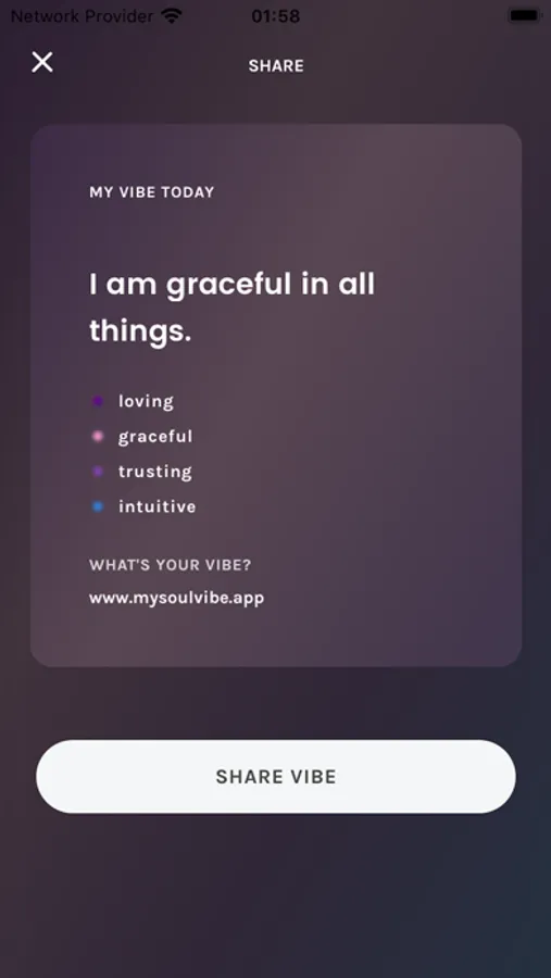 MySoul Vibe uses a combination of math, physics, psychology, and mystical sciences to analyze and interpret your vibe. The resulting analysis clearly presents your current energetic statement through color, words, and sounds. The unique spectrum of vibrations influencing your energy is changing all the time and by practicing MySoul Vibe regularly, you will begin to see patterns between your emotions, physical experiences, and energy.