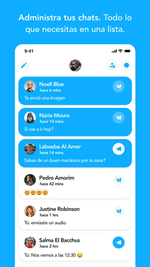 En la página principal verás todos tus Chats y podrás interactuar con las conversaciones. Si la conversación está en azul es que tienes mensajes sin ver y el botón del altoparlante es para silenciar una conversación. Sencilla, intuitiva.