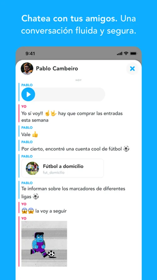 Elige una foto, un video, graba un audio o simplemente escribe un mensaje y mantén la conversación con tus amigos. Todo de forma segura y privada.