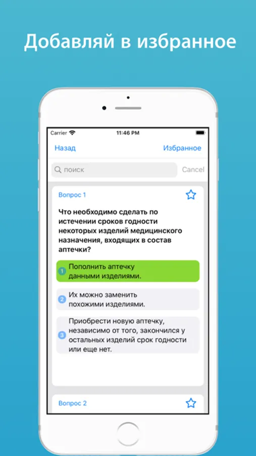 • Работа над ошибками - в режимах "Экзамен", "Марафон" и "Тренировка в избранном" Вы можете сделать работу над ошибками.