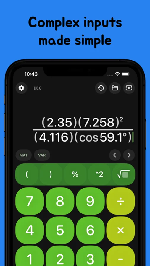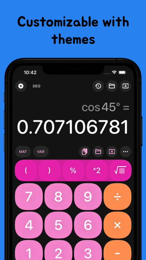 Simplicity meets elegance in the app’s intuitive design. The interface is smooth, fluid, and fun. Buttons are large and colorful, arranged to maximize efficiency and ease of use. The whole expression appears on one line as you input it, and then together with the result when you press enter. Characters are given high-quality mathematical typesetting. You can type in crazy long expressions and it’s a breeze. Results are saved to a history tape for future use. And you have the freedom to customize your calculator with different themes.