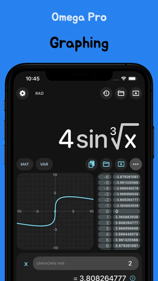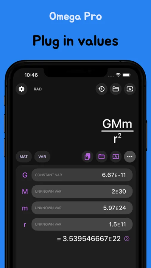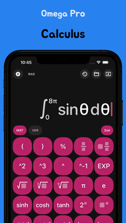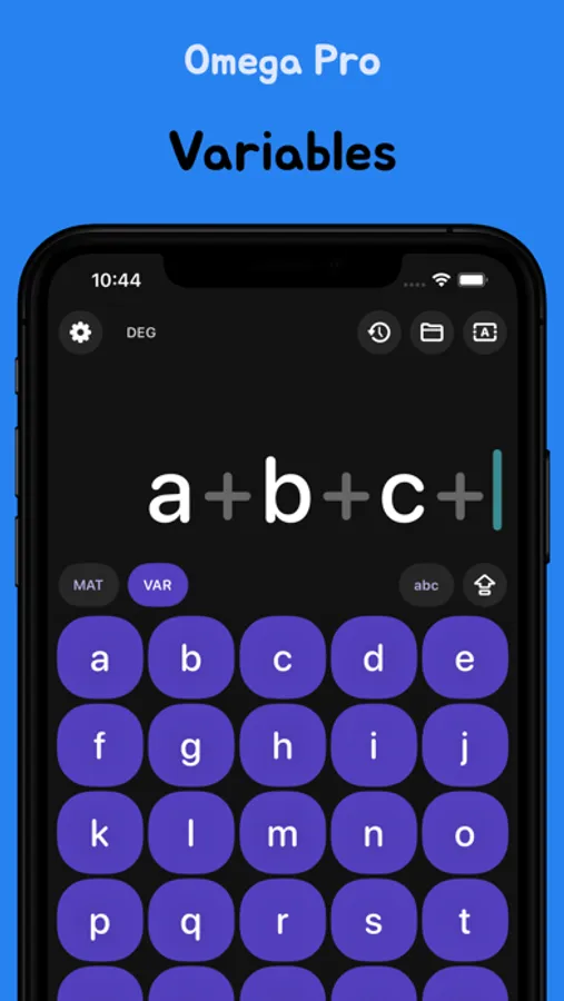 Unlock even more features with Omega Pro. Available as a single in-app purchase. All 30+ themes, an interactive text pointer for editing the input line, and saving and exporting your past calculations. Variables for storing and recalling values, plugging numbers into expressions, graphing functions, and more advanced operations like summation, derivatives, and integrals.