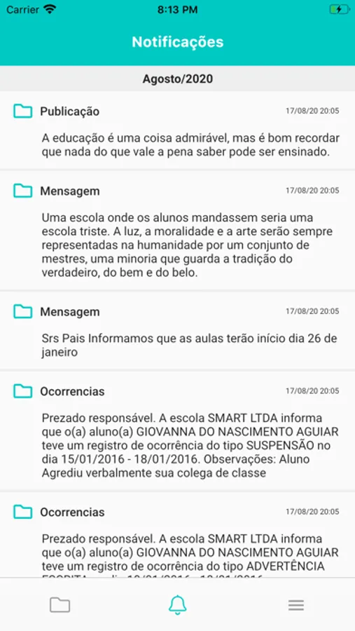 Avisos, ocorrências escolares, declaração de pagamentos, enfim....