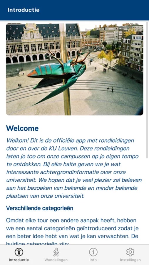 Welcome! This is the official app with walks through and about KU Leuven. These walks allow you to discover our campuses for yourself, and at the same time gain fun background information about our university. We also look at many well-known and lesser-known places in the city. Have fun exploring!