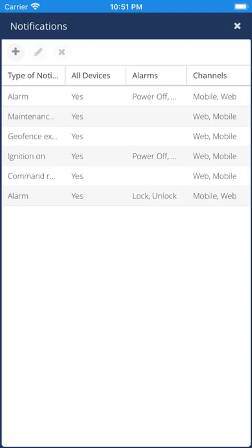 -Notificaciones Push y email de encendido, apagado, entrada o salida de geocerca, exceso de velocidad, desconexión de batería, Botón de pánico.