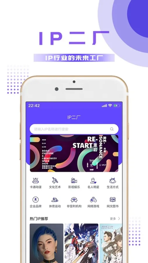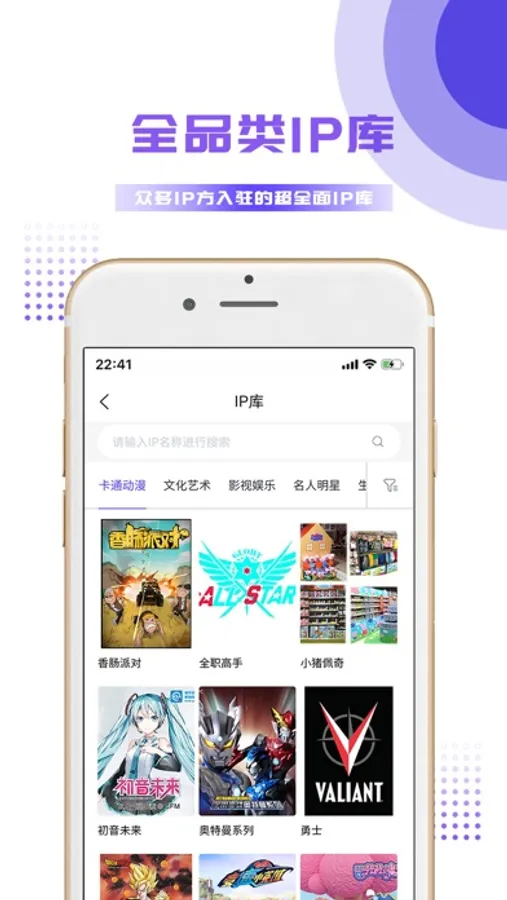 "IP库—收录包括卡通动漫、文化艺术、影视娱乐、名人明星、生活方式、企业品牌、体育运动、非营利机构、网络游戏、网文图书十大领域的IP,打造全中国最新最全的IP收录库;