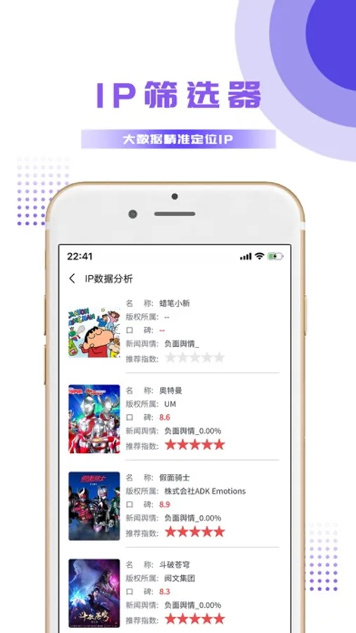 IP筛选器—全方位认知IP价值,基于海量第三方数据经过智能算法计算评估,从匹配度、风险评估、热度&知名度、商业价值、推荐指数等全方位进行统计及解读IP,采用科学四步法为代理商提供IP精准定位及筛选。"