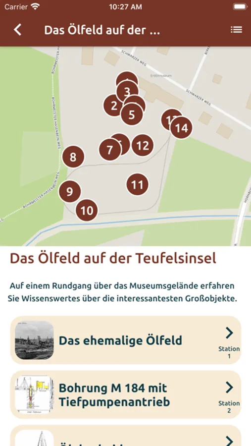 Die kostenlose Museums-App des Deutschen Erdölmuseums Wietze (Ldkr. Celle, Niedersachsen) bietet drei GPS-gesteuerte Entdecker-Touren zu den kulturlandschaftlichen Relikten der Wietzer Erdölindustrie. Erfahren Sie mehr über die wichtigsten Großexponate auf dem weitläufigen Freigelände, erkunden Sie die Standorte der einstigen Produktions- und Transporteinrichtungen, entdecken Sie Gebäude aus der Zeit des Erdölbooms um 1900.