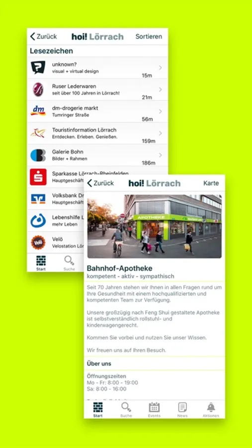 Die hoi! App von Pro Lörrach zeigt dir Geschäfte und Boutiquen, Restaurants und Imbisse, Hotels und Übernachtungsmöglichkeiten, Dienstleister und Industrieunternehmen, Freizeit- und Sportaktivitäten, Kulturveranstaltungen und Bildungsangebote.