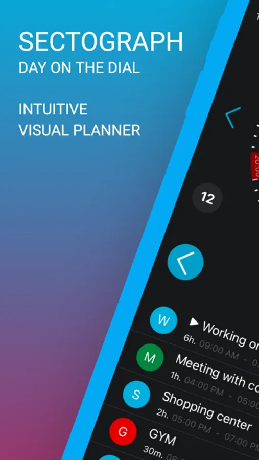 The visual planner works like an analog clock widget. It automatically receives all the calendar events and overlays them on the 12/24 hour dial. This provides a different, more efficient view of your schedule.