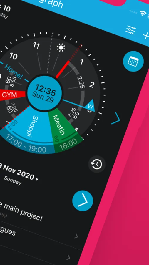 The calendar and analog clock, combined, give a visual representation of your busyness, allow you to effectively plan and calculate daytime.