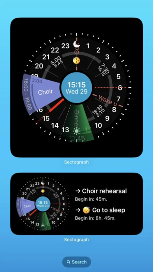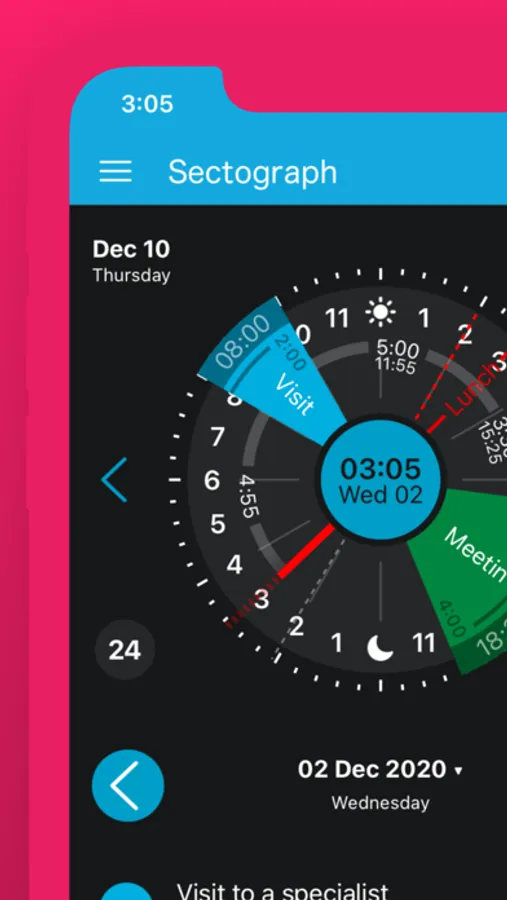 Sectograph is a visual day planner that displays your calendar events on a pie chart in the form of a 12/24 hour clock face. It's a different way of looking at the day