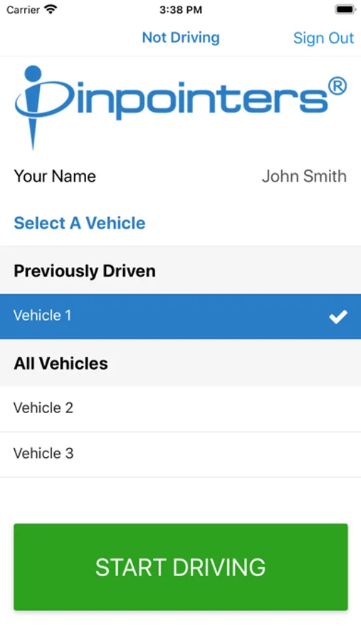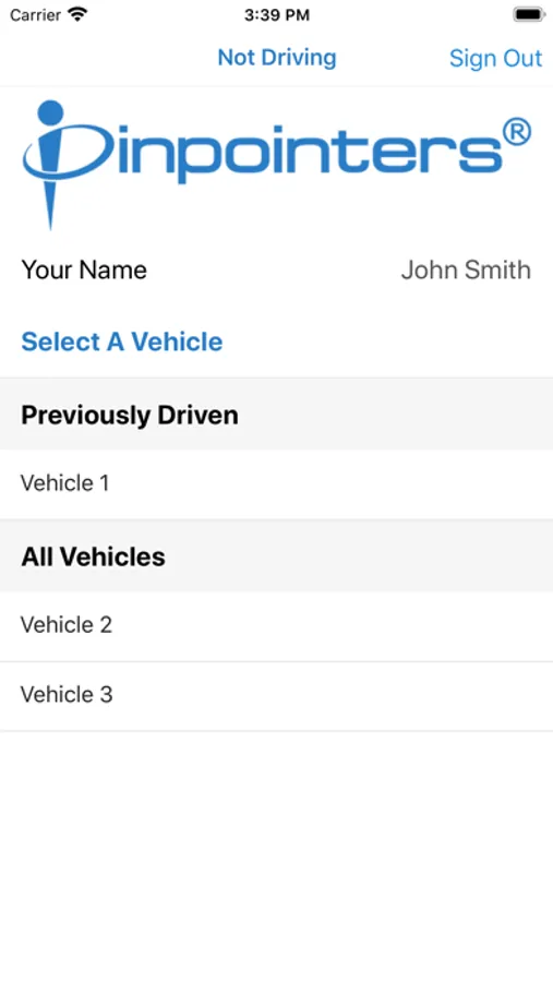 The Pinpointers Driver ID App allows a driver to declare which vehicle they are currently driving. The driver can quickly choose from a recently driven vehicle or from the full fleet list.