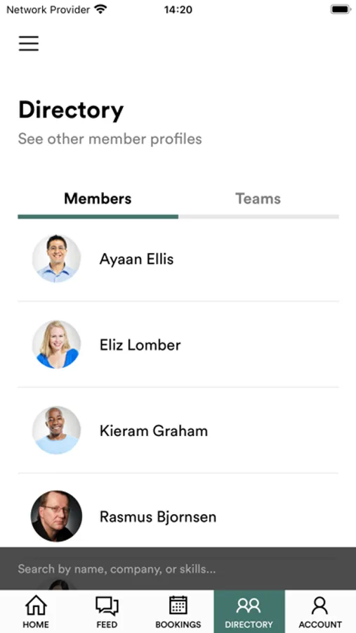 * Search through the members directory to locate and connect with specific skills,