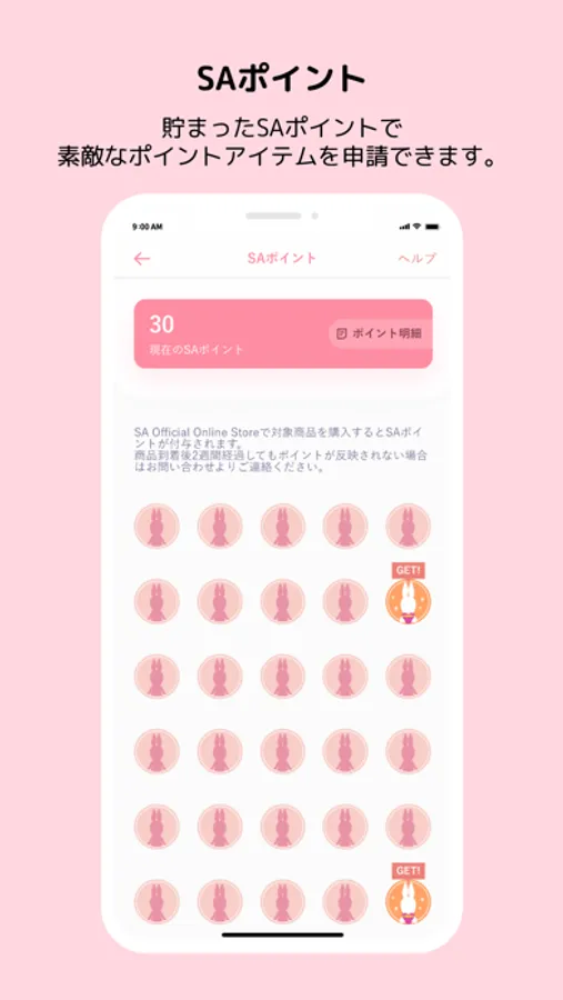 - 貯まったSAポイントに応じて、素敵な”オリジナルポイントアイテムが GET!”できます。