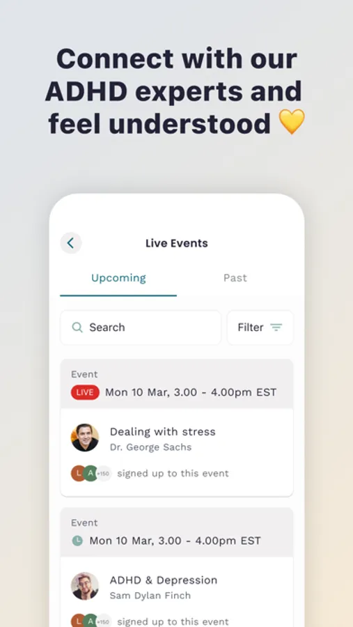 - Live events with a psychologist, counselor, ADHD coach, home organizer and more