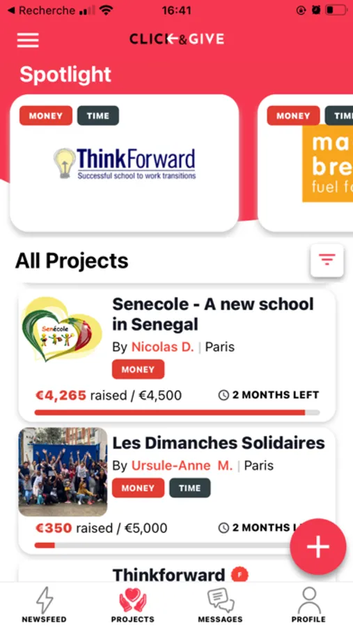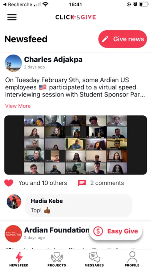 Click and Give aims at facilitating and increasing employees’ involvement in charitable projects. The app enables employees to donate time and/or money, to get information and interact via a newsfeed and a messaging system. With the app all employees have the possibility to share a project of their own and raise funds. If the latter falls into the Ardian Foundation’s mission, there will be a matching system.