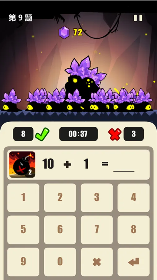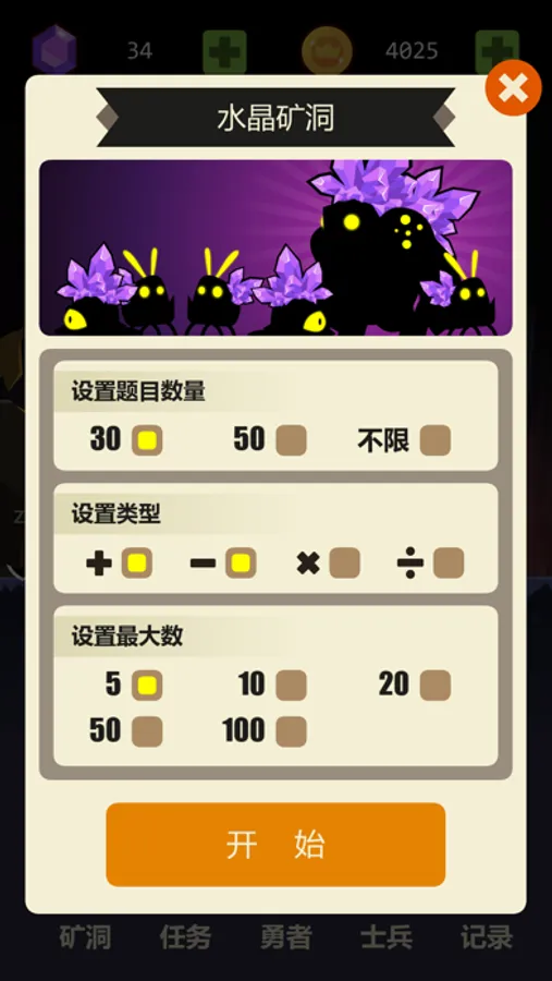 水晶是游戏的基础,只有获得足够的水晶,才可以去闯关。每日任务的赏金关卡,会掉落大量的金币和勇者经验。口算可以自行设置类型(加、减、乘、除),也可以设置运算的最大数,最大数越大,水晶掉落得越多哦。