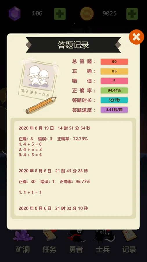 口算勇者是结合了做口算和闯关升级勇者,士兵,并随着通关关卡,解锁更高级别的士兵,合理搭配你的士兵来完成闯关。