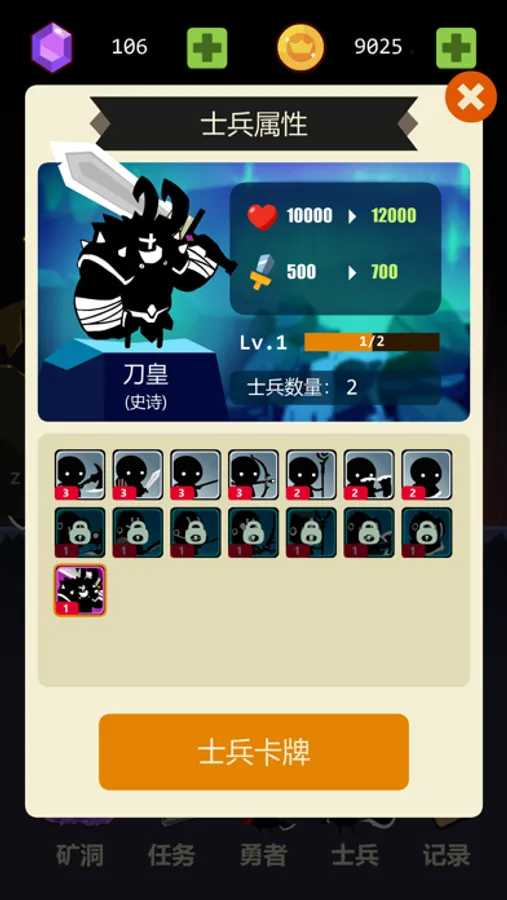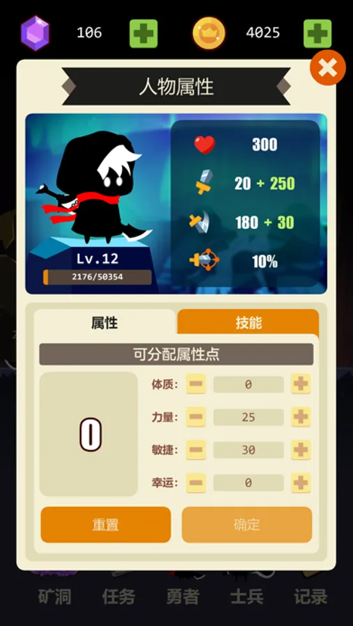 闯关得的金币,可以升级你的士兵,勇者每升1级会获得5个属性点,可以自行选择不同的方向增加属性点。