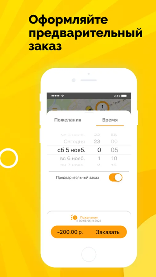 Планируете поездку до аэропорта или на вокзал? Воспользуйтесь функцией предварительного заказа. Автомобиль будет подан к указанному времени.