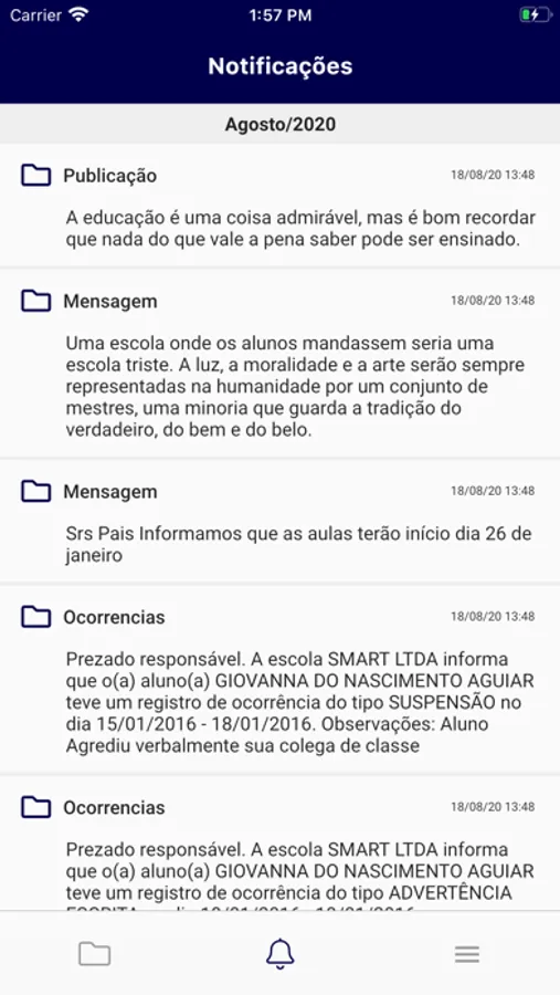 Avisos, ocorrências escolares, declaração de pagamentos, enfim....