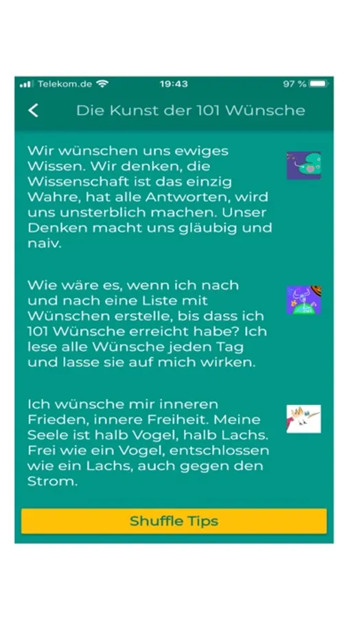 We enable you to pursue your authentic wishes more effectively, letting go of unhealthy wishes, far from your real desires. The app is structured in exercises. The current app version focuses on a powerful exercise, which builds the foundations for further exercises: DIVE INSIDE YOUR WISH.