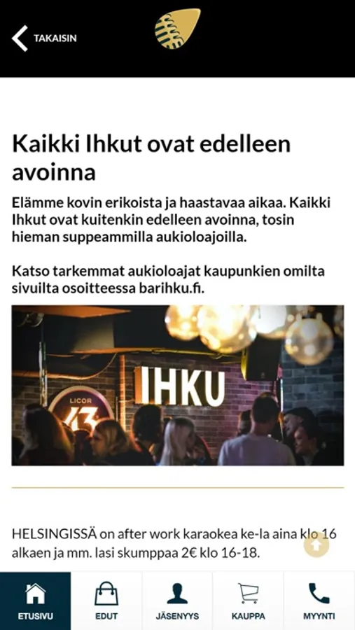 Ihku Appi on uudistunut! Sovelluksen kautta näet Ihku-ravintoloiden sekä kumppaneiden tarjoukset, tapahtumat, tuotteet ja voit ostaa myös pääsylippuja tapahtumiin.