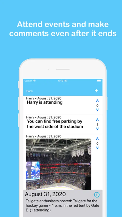 Keep track of attendance at the event, post a comment, or upload a photo to those interested before the event or after the event has ended. If you like an event, you can even upvote the post.