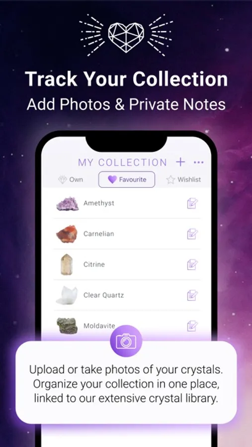 • Add private notes for each stone, creating a personalized catalog of your crystal journey.