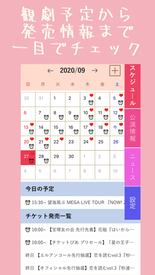 ミュージカル、演劇など舞台のチケット発売日をカレンダーや一覧で見られるアプリ。