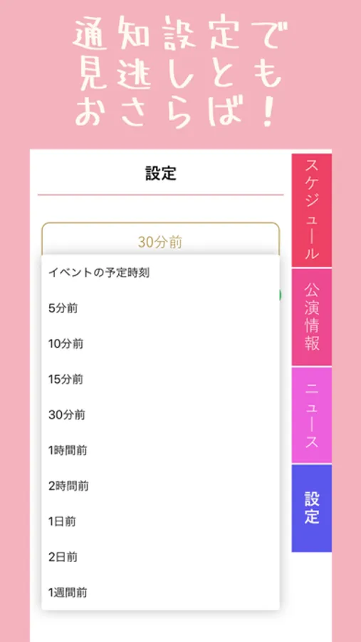 通知機能:1週間前から5分前まで、ユーザーが設定したタイミングで発売(申込)開始前・発売(申込)終了前に通知