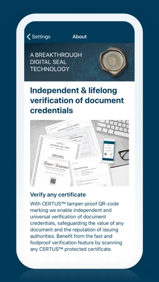 CERTUS sets a new standard in securing value documents, credentials and qualifications. It combines breakthrough digital seal technologies protected by the blockchain with a secure QR-code applied to your documents.