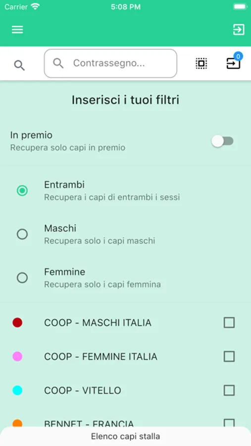 E' possibile filtrare i capi per il contrassegno, il sesso, il premio e per le varie filiere di vendita rispettando i corrispondenti criteri e parametri.