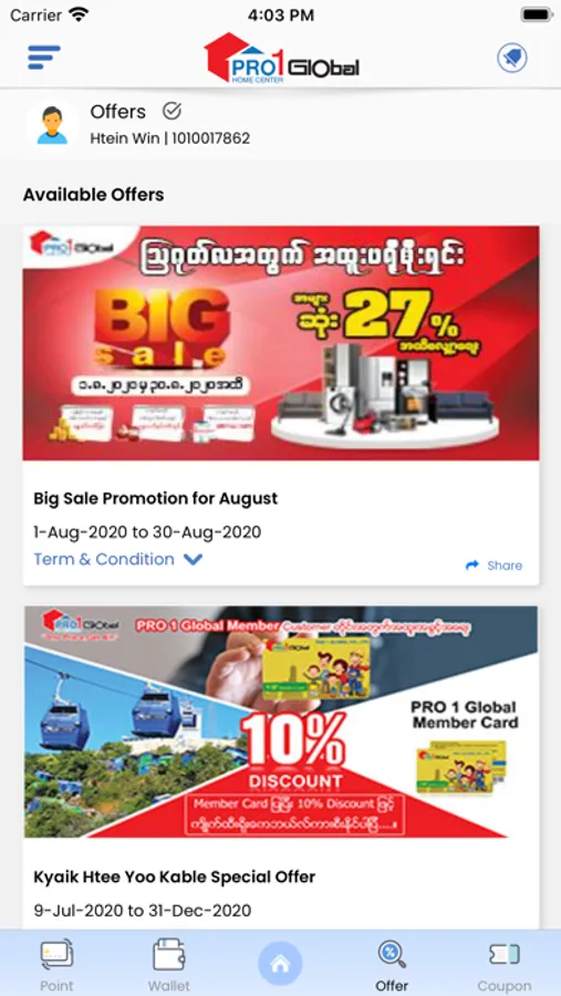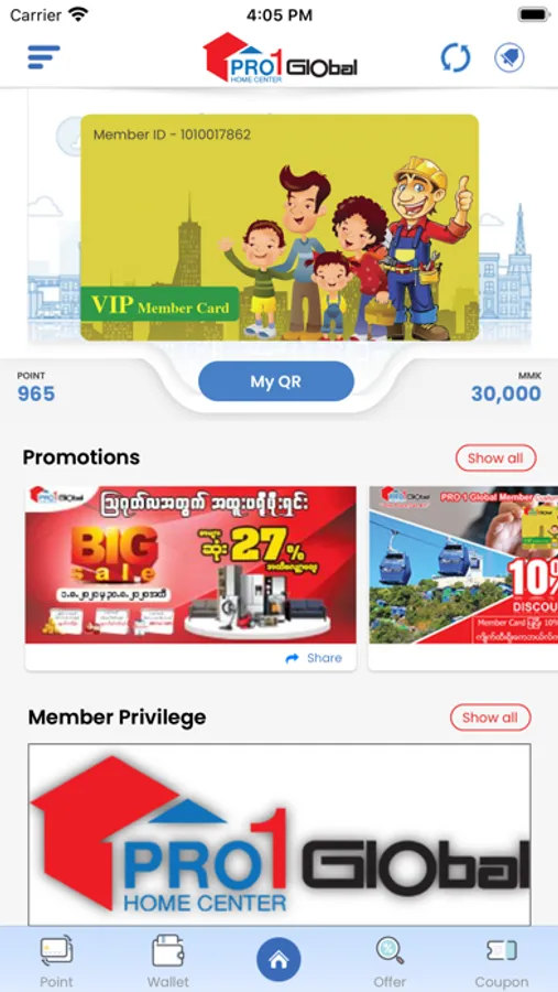 PRO 1 Global Members is the special privilege program to the specific customer. To join PRO 1 Global Member, firstly, have to receive a PRO 1 Global Member card ID by purchase product in PRO 1 Global 500,000mmk exclude structure products and project sales. Every member will get special discount for exclusive brands and receive 1 point for every 5,000 MMK purchase from PRO 1 Global Home Center within one day.