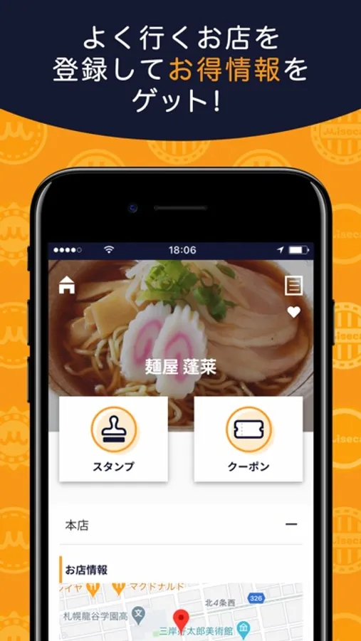 スタンプカード画面の「QR読込でスタンプGET」からお店に設置されたQRコードを読み取ってください。