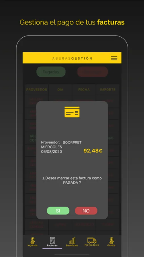 Además te permite controlar todas las facturas de proveedores y marcar las que ya has pagado para saber cuánto le compras a un proveedor y cuantas facturas tienes pagadas o pendientes de pago.