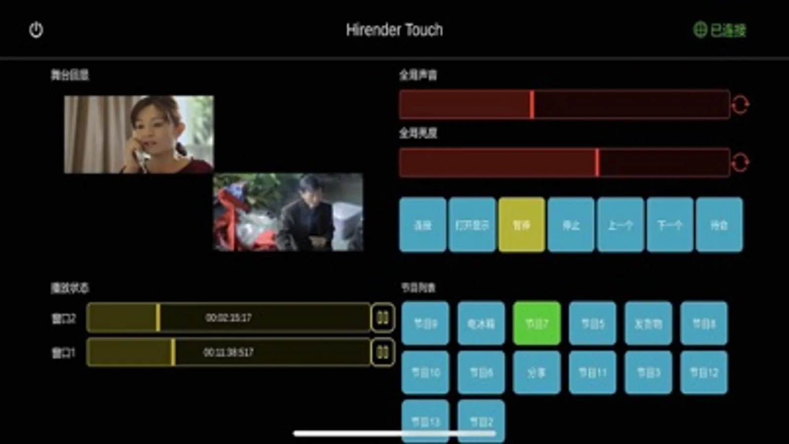 Hirender Touch是澜景科技专门为Hirender S3开发的基于移动设备使用的控制软件,Hirender Touch界面简洁、操作简单,对接S3只需在同一个局域网下通过IP连接,连接后实时获取节目列表,实现S3节目管理的远程控制与监视。