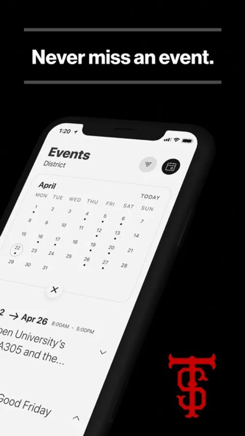 The event section shows a list of events throughout the district. Users can add an event to your calendar to share the event with friends and family with one tap.