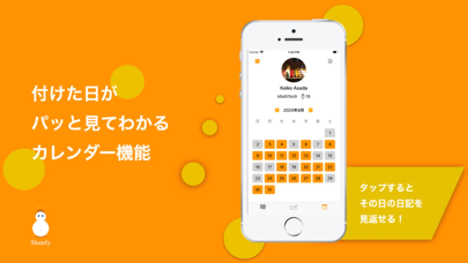 日記を付けた日のマスがオレンジ色に塗られるため、日記を付けた日を、一目で確認できます。