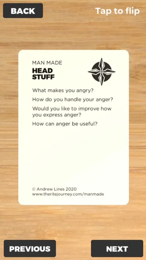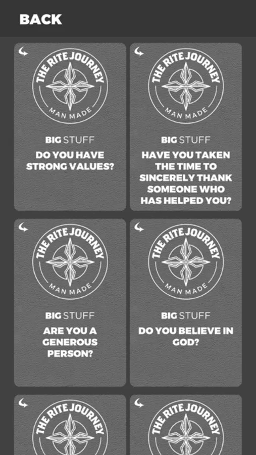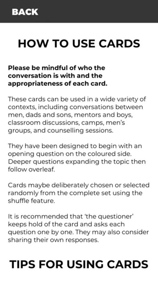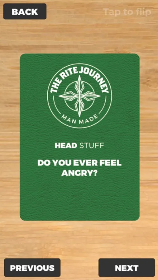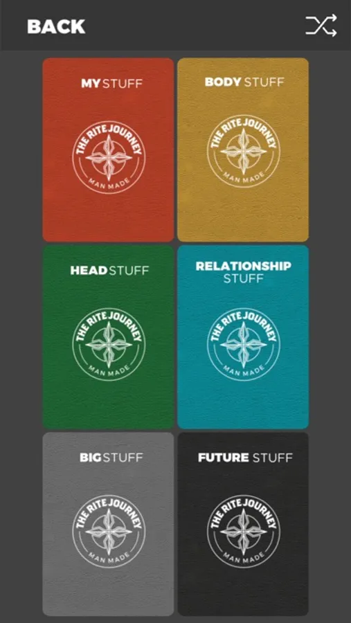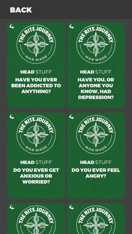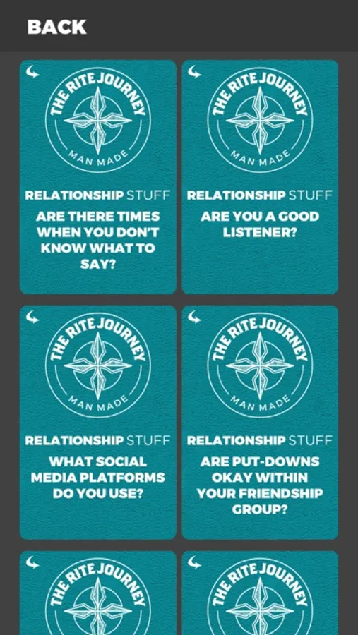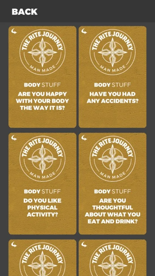 The Rite Journey Man Made App has been designed to foster conversations with males. They help men and boys tell their story through a set of 87 cards, with a total of 412 questions, divided into six suits: My Stuff, Body Stuff, Head Stuff, Relationship Stuff, Big Stuff and Future Stuff.